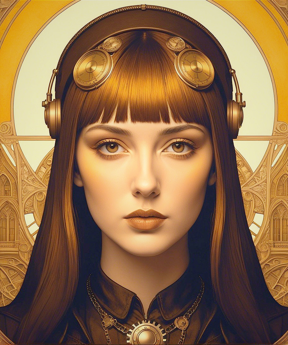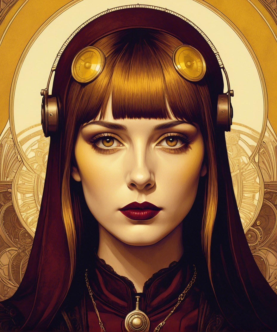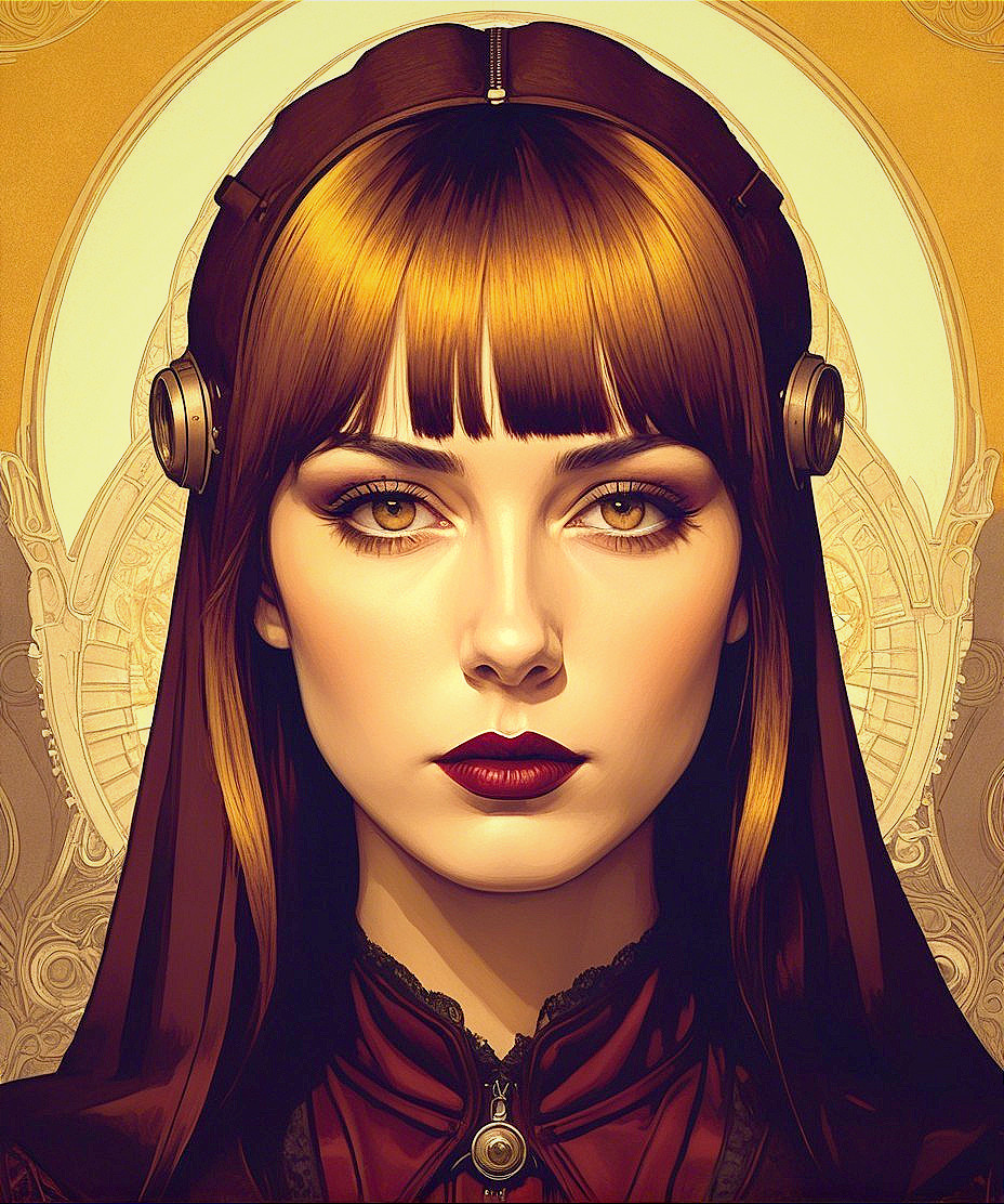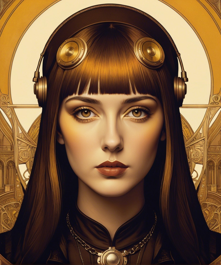 A striking portrait of a woman with golden hair and vintage headphones, wearing a dark cloak. The warm tones and intricate background give a regal, ethereal vibe.