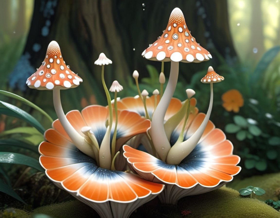 A whimsical digital illustration of oversized, glowing orange mushrooms in a magical forest with blue flowers and subtle lighting.