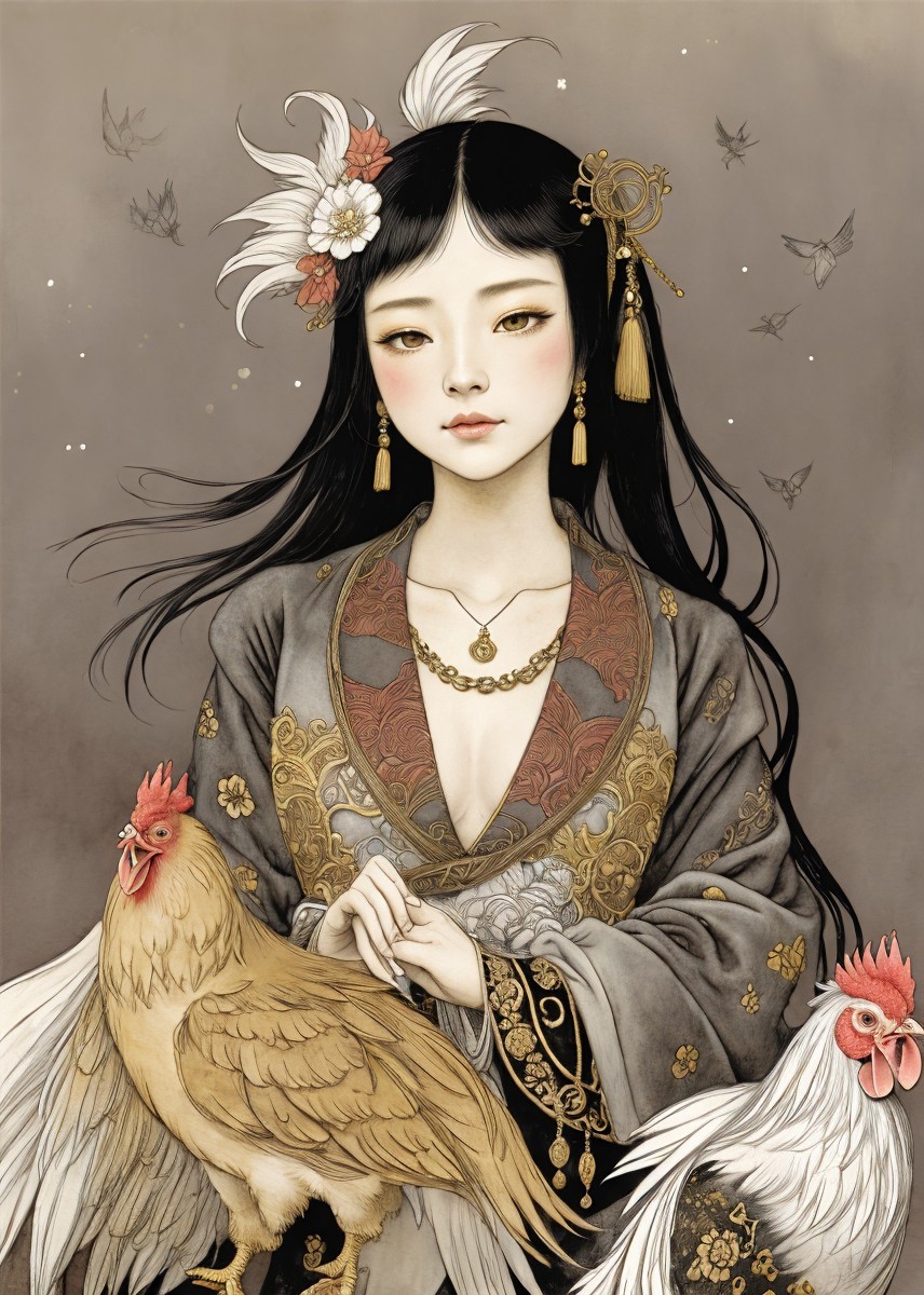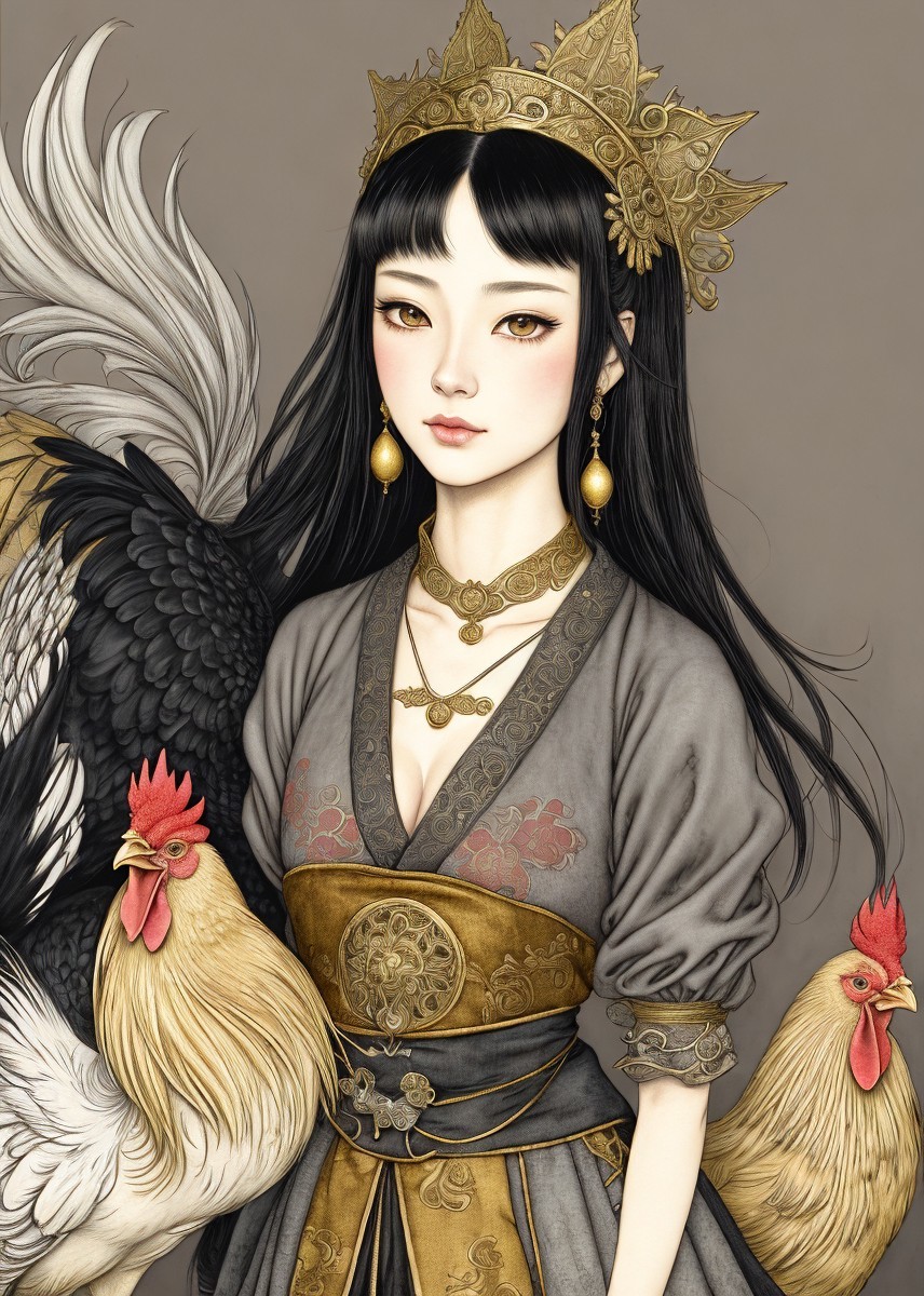 Legend of the Girl and the rooster, Medieval Japanese Artists Sumi-e Style, Velvet Black, Shabby, Dull Gold, Amber Gray, Golden Ratio, Surreal Fantasy, Elegant, High Definition Ultra Fine 3D Line, Zenangle Style, Watercolor Patchwork , Arthur Rackham Style, Paul Kidby, Gediminas Prankevicius, Jacek Jerka, Extremely Detailed, Intricate, Thoughtful, HDR, Fractal, Beautiful, Award Winning, Fantasy Look, Fantasy, Crisp Quality