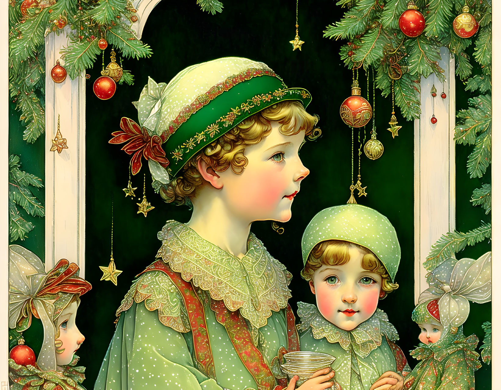 Christmas elf in the style of Mabel Lucie Attwell, vintage Christmas card,