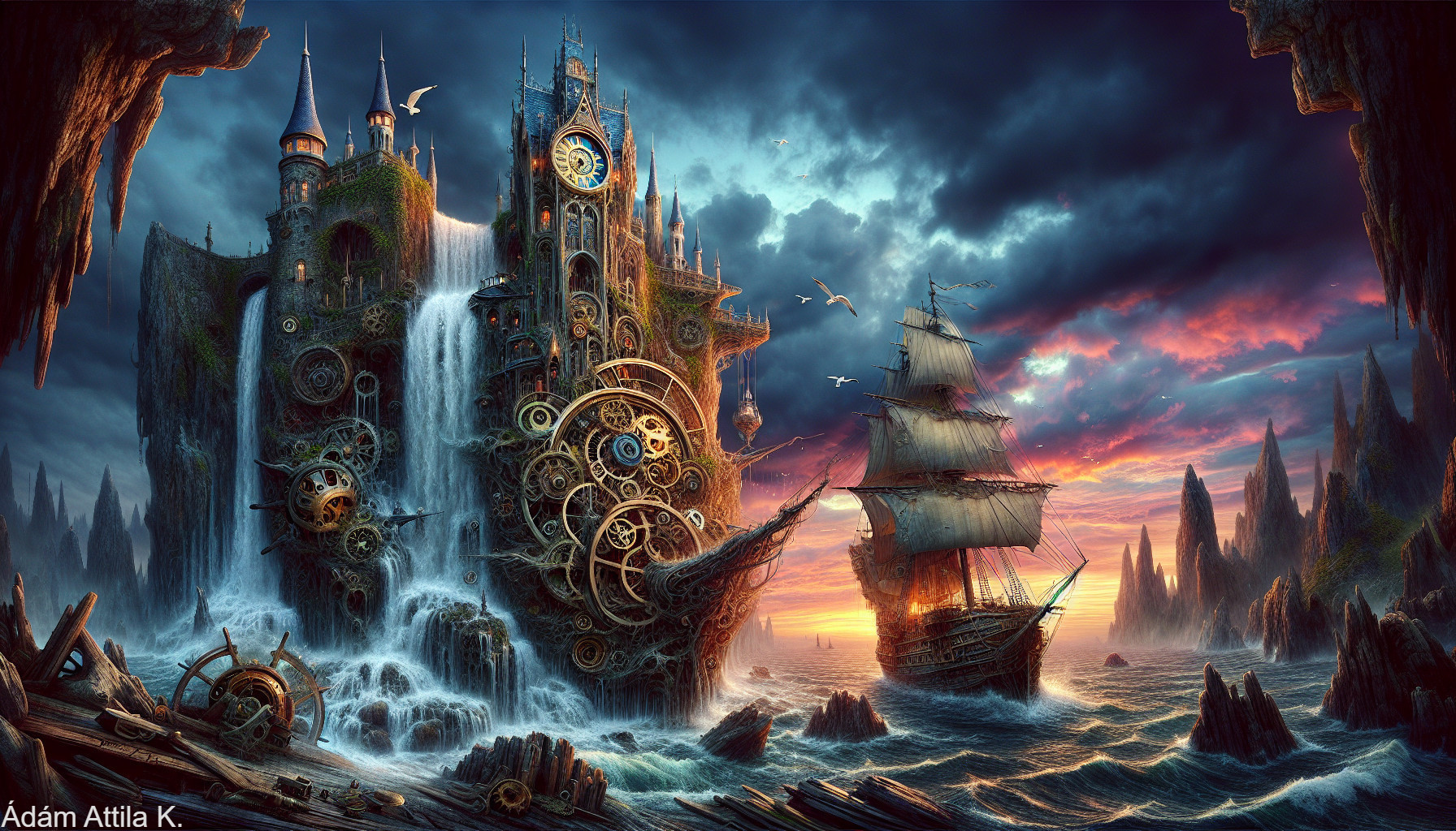 Surreal steampunk castle among waterfalls with sailing ship nearby under sunset sky.