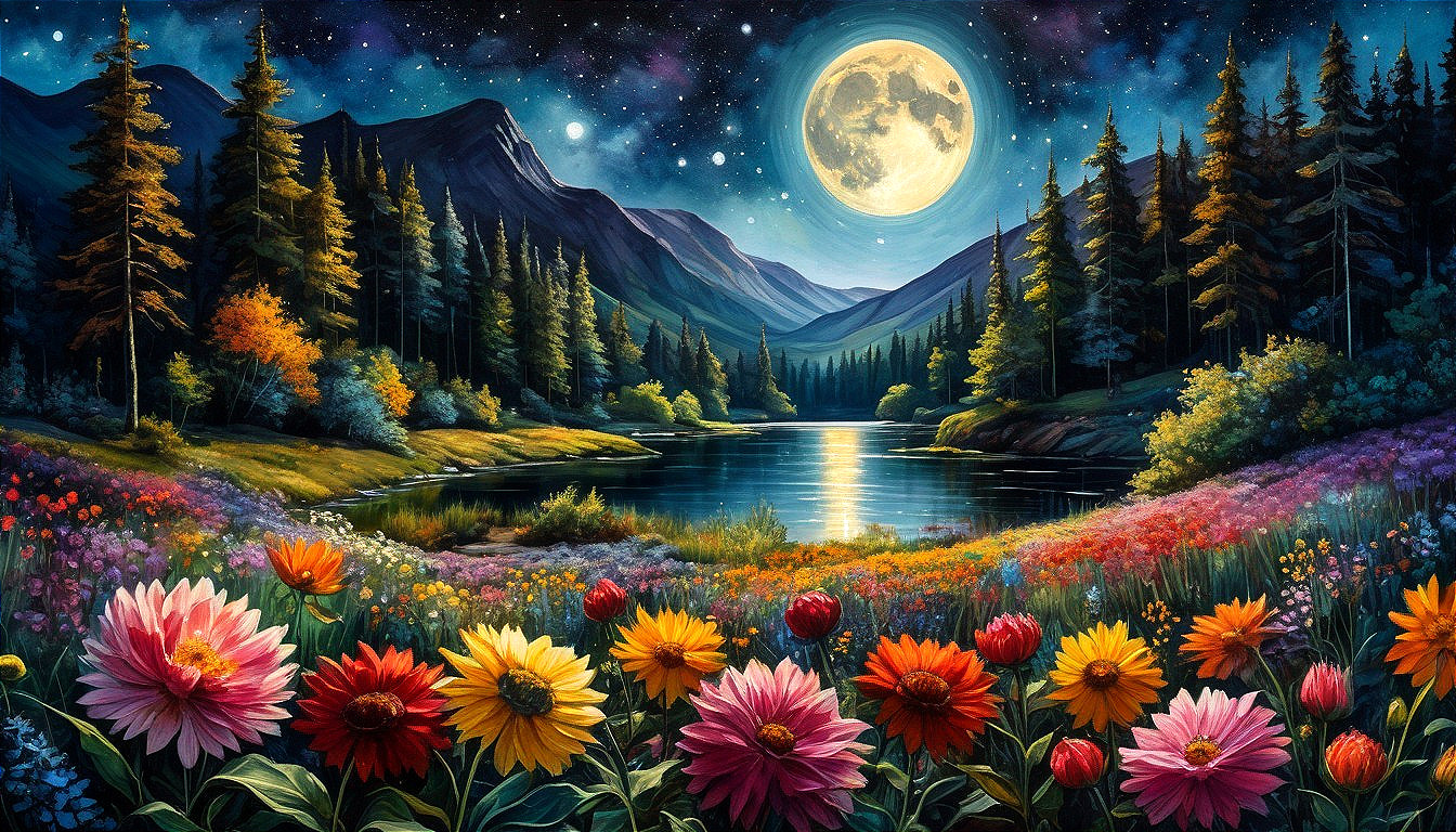 A vivid landscape painting featuring colorful flowers in the foreground, a serene lake, pine trees, mountains, and a full moon in a starry sky.