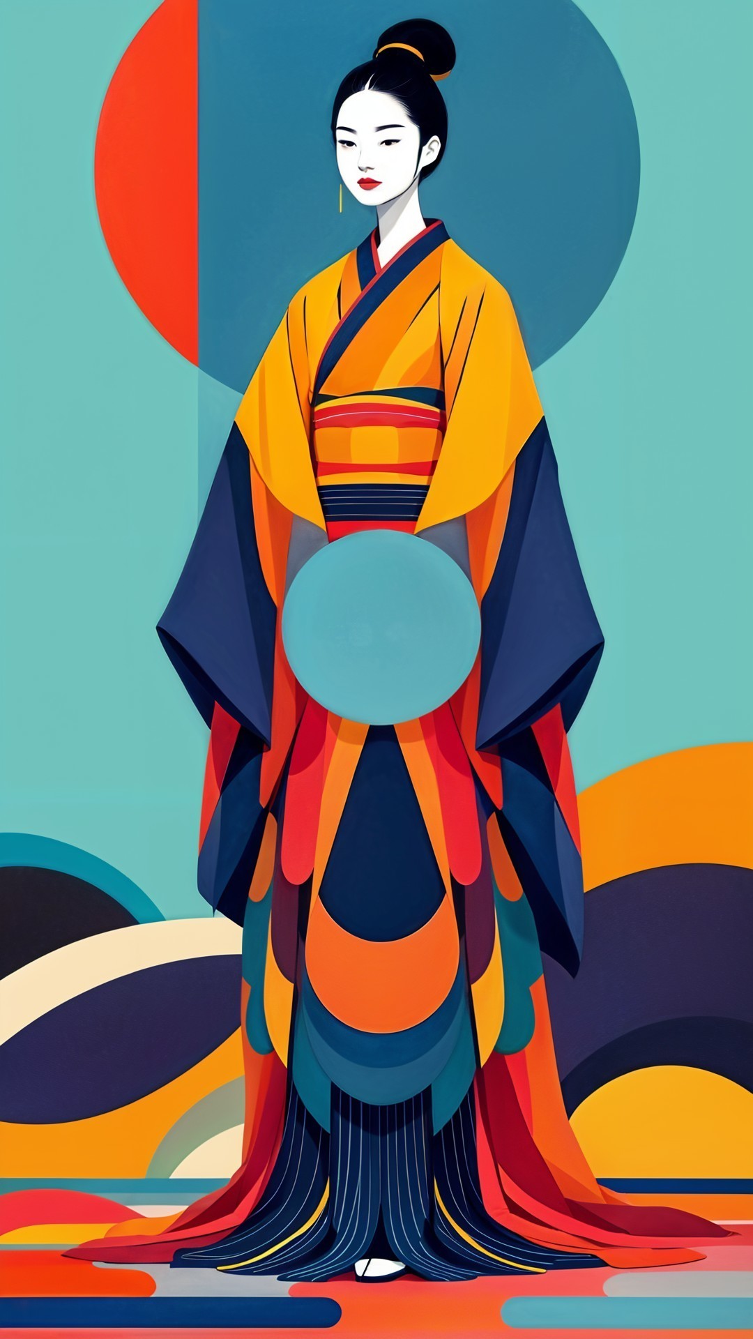 At the center stands a noble Japanese woman from the Heian period (794–1185), her silhouette elegant and dignified, yet dynamically intertwined with the swirling chaos around her. She wears the traditional junihitoe, but instead of flat geometric layers, the robes dissolve into cascading gradients and curvilinear bands of color that ripple like silk in motion. The garments ebb from one tone to another — dew-soft pink fading into warm coral (Pantone 2341 C → Pantone 7416 C), twilight violet melting into midnight blue (Pantone 7670 C → Pantone 2756 C), and delicate gold dissolving into luminous amber (Pantone 7404 C → Pantone 1235 C).