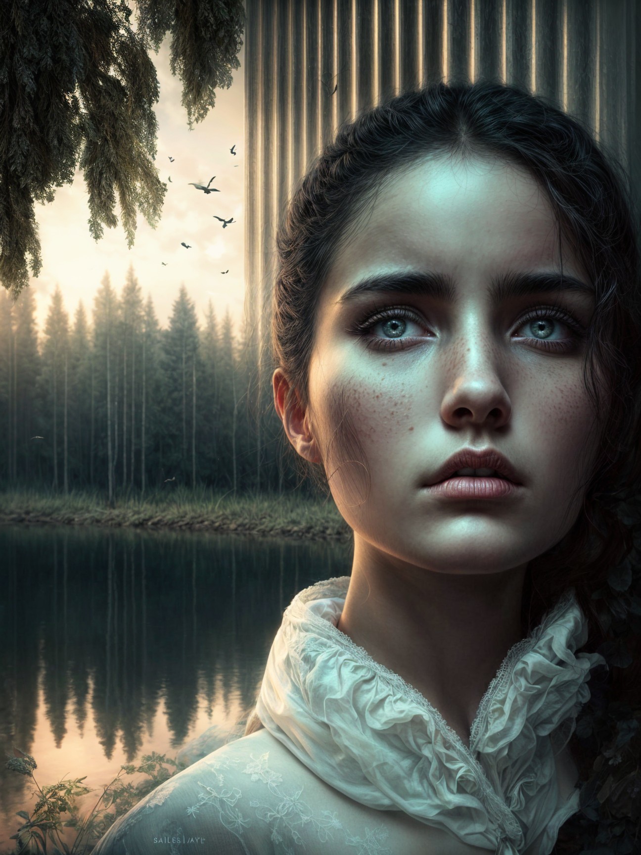 (Try from Fire Hot Indeed) - A serene portrait of a young woman by a tranquil lake, surrounded by tall trees. Soft light enhances her features, and the background features distant mountains and birds in flight.