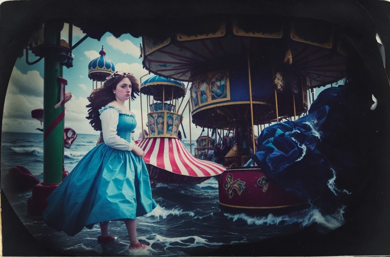 A woman in a blue and white dress stands beside a carousel on a shore, waves merging surrealistically with the scene.