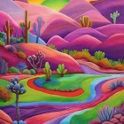 This vibrant landscape features rolling hills in vivid shades of purple, green, and pink, with stylized trees and a tranquil house under a bright sun, creating a whimsical, surreal atmosphere.