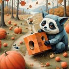 A playful panda sits on a colorful block in a vibrant tree, surrounded by geometric shapes and a scenic backdrop of mountains and blue skies, creating a whimsical, cheerful atmosphere.