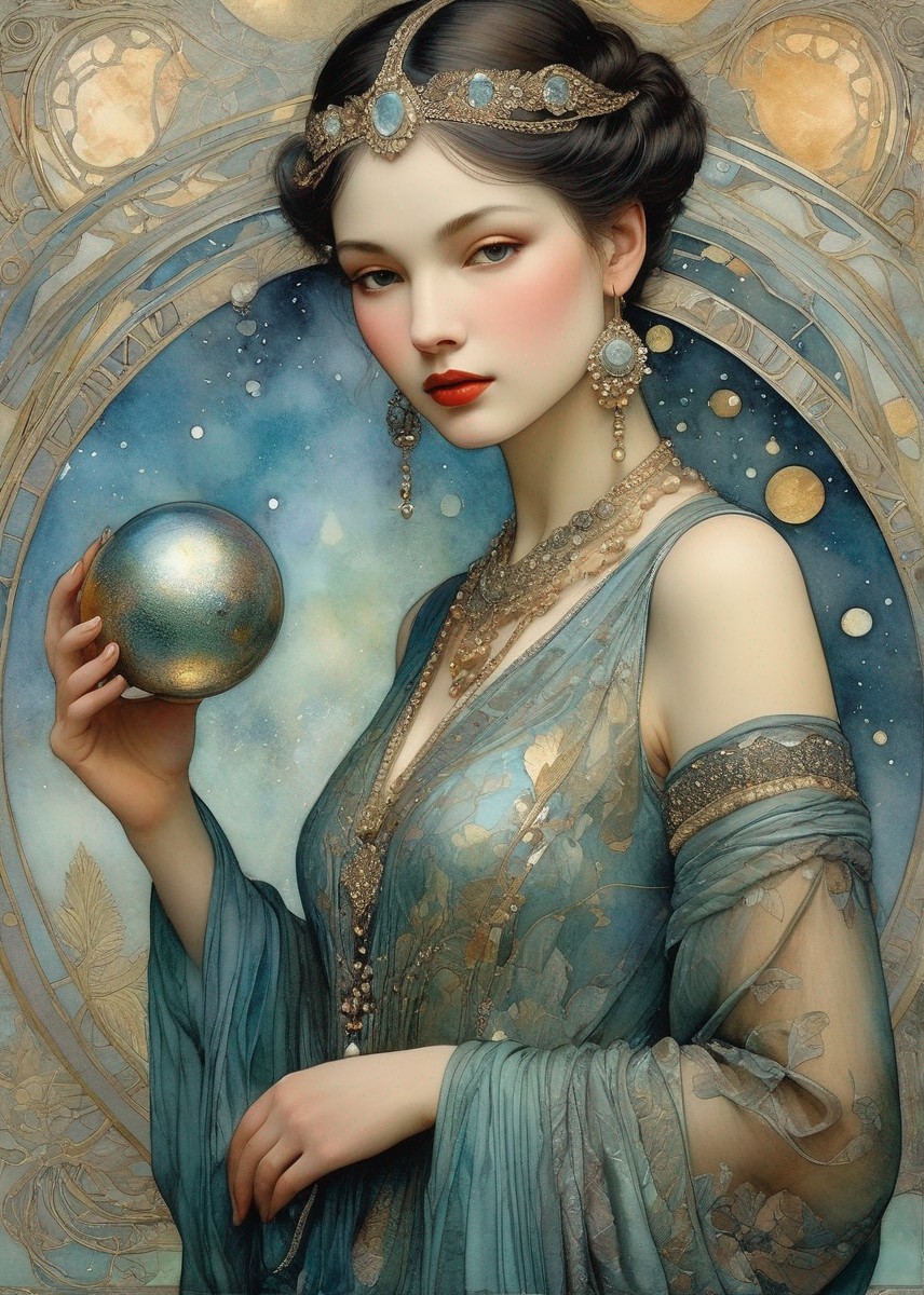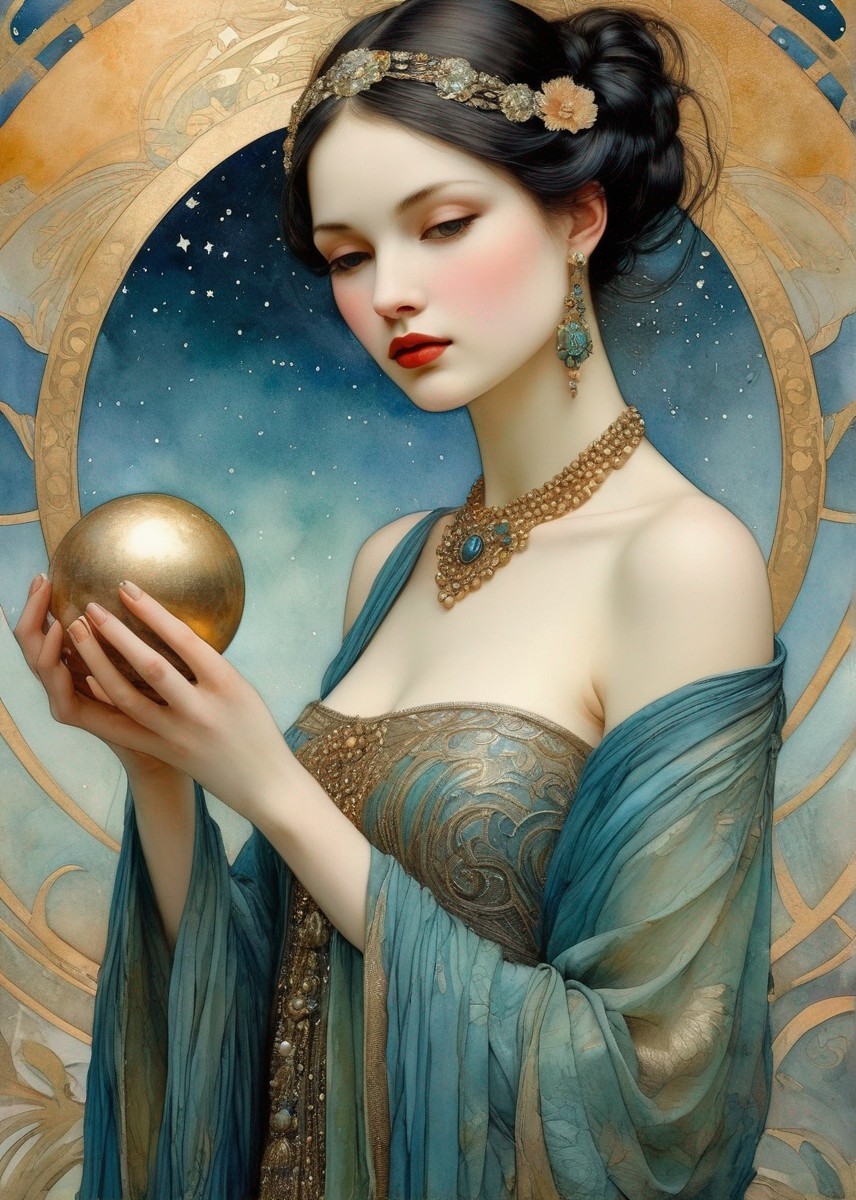 + Prompt:Metallic colors watercolor and ink By Jamie Heiden, Daniel Merriam, Paul Klee, Karol Bak, Dee Nickerson, extremely detailed, high definition, crisp quality, ultra detailed background art nouveau New Year’s Eve ball.