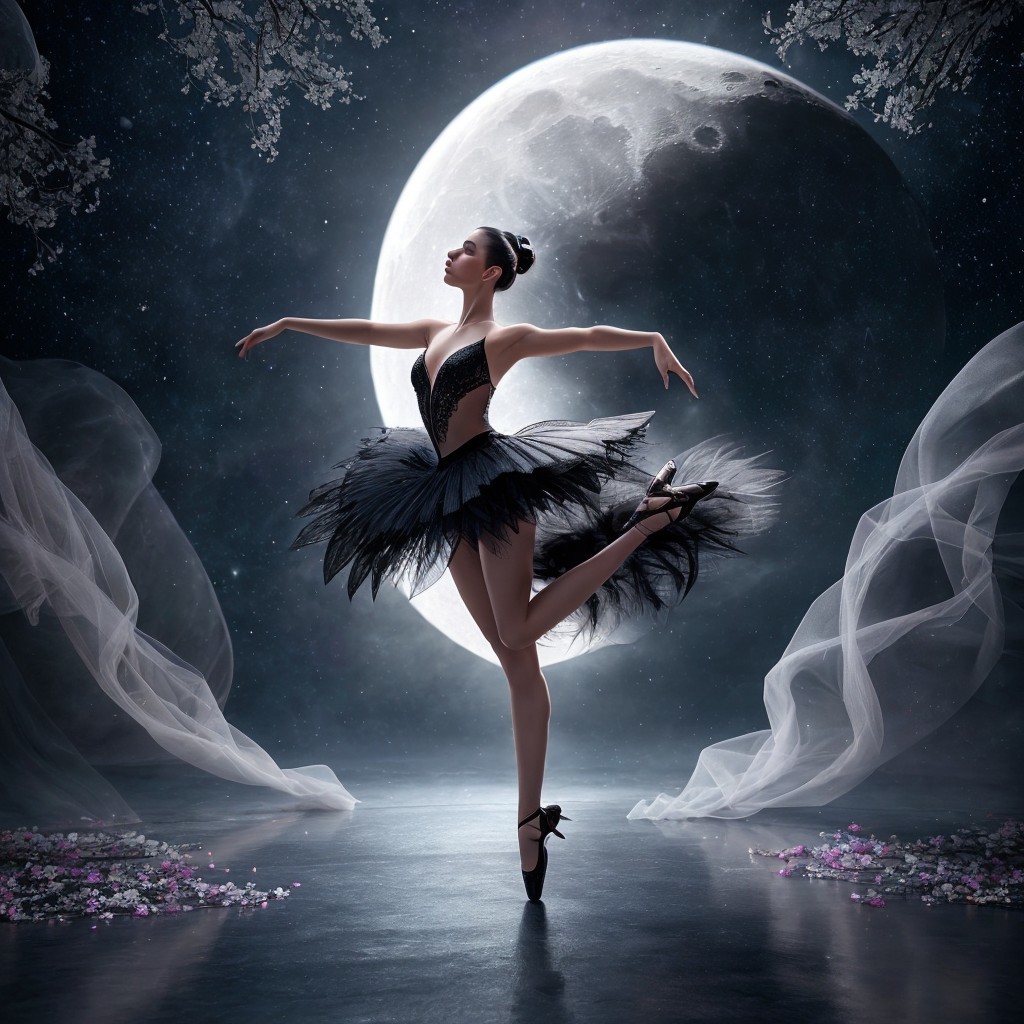 breathtaking shot of Black Swan ballerina dancing on the moon, muse, graceful, ethereal, femenine sensual pose, alluring, stunning, intricately detailed, unreal engine, octane render, dreamlike lighting