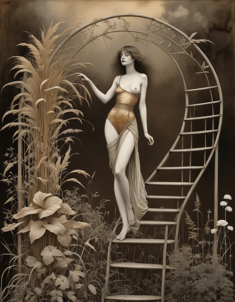 A monochromatic artwork portraying a woman in a draped dress ascending a circular staircase amidst tall grasses.