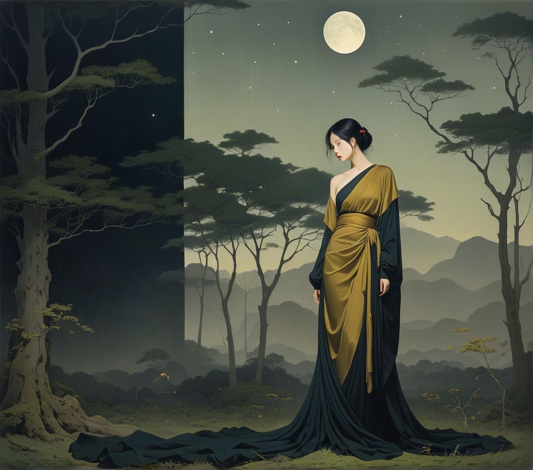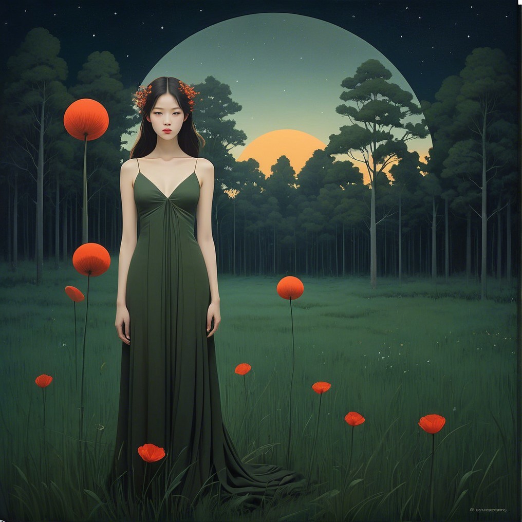 A serene scene depicts a young woman in a flowing white dress, kneeling among flowers in a mystical forest under starlit skies, embodying tranquility and connection with nature.