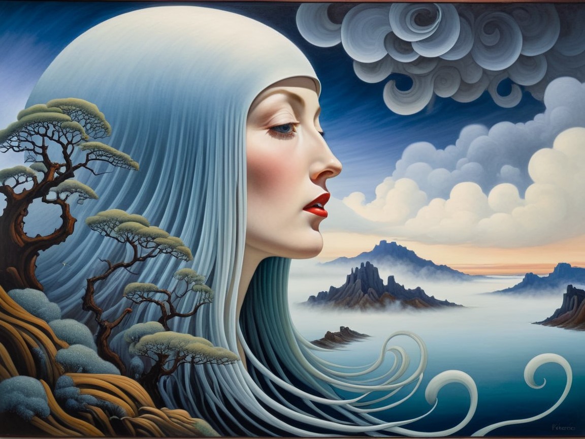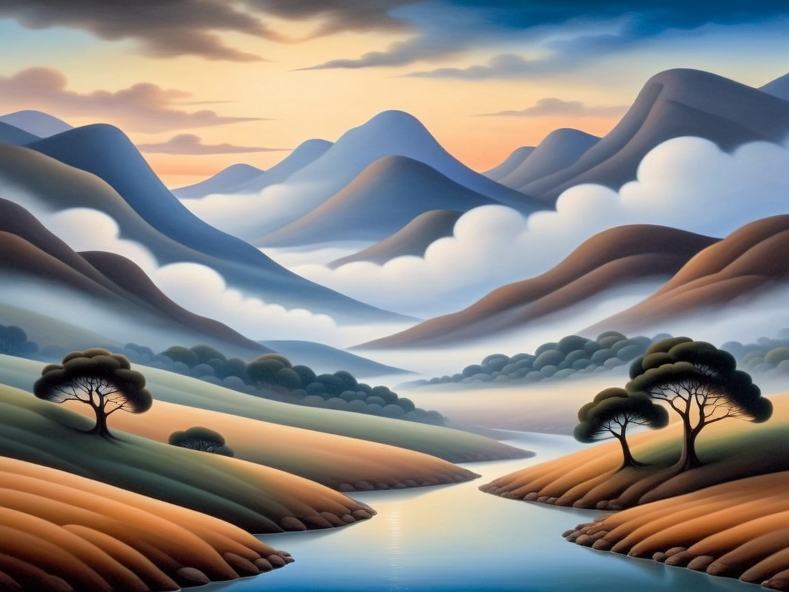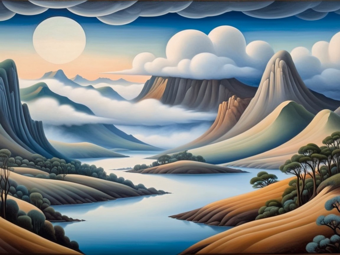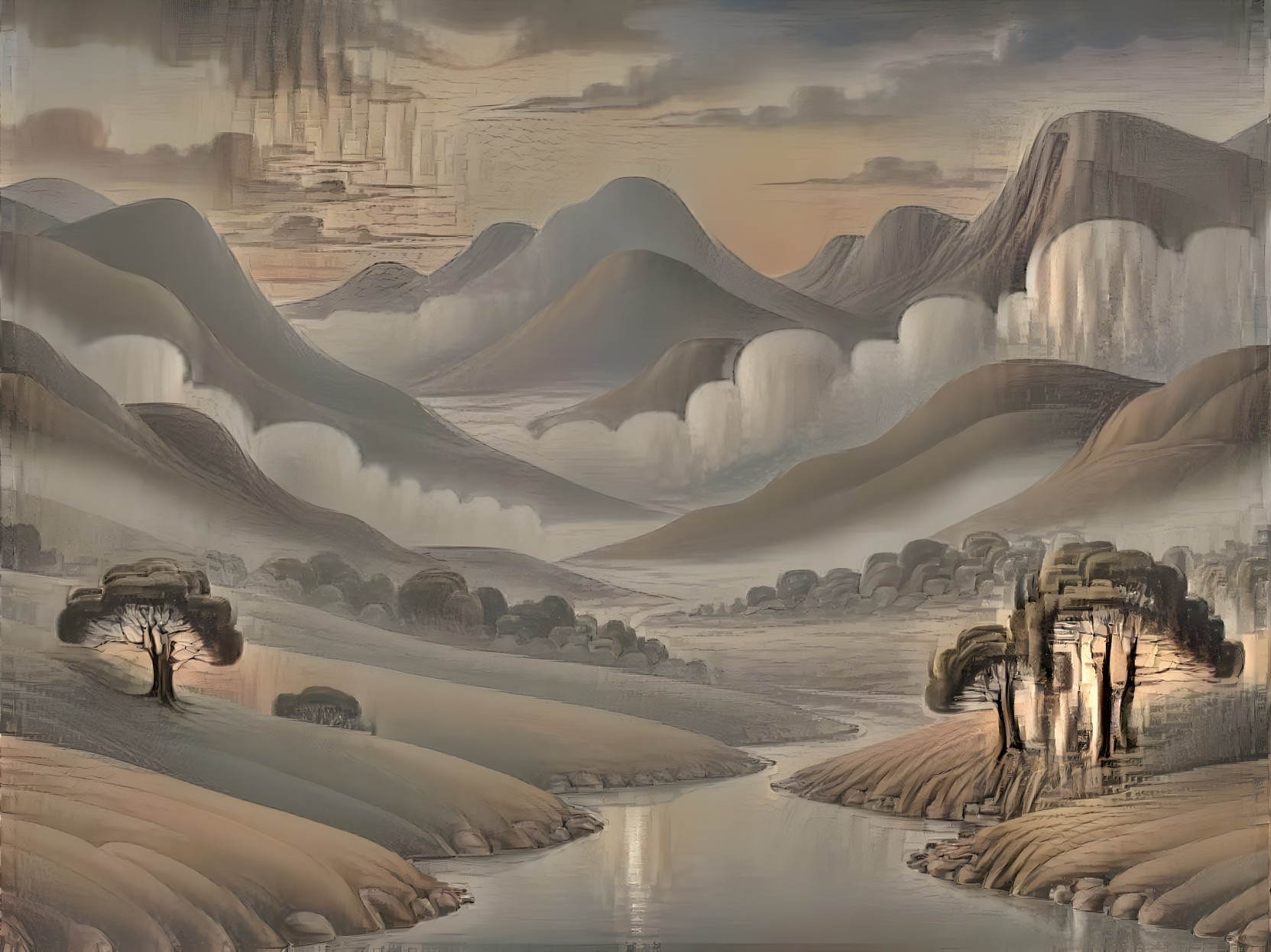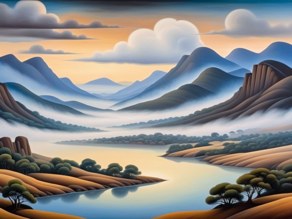 A serene landscape features towering cliffs and soft riverbanks, set against a backdrop of mountains and dramatic clouds, blending earthy tones with hints of greenery and tranquil water.