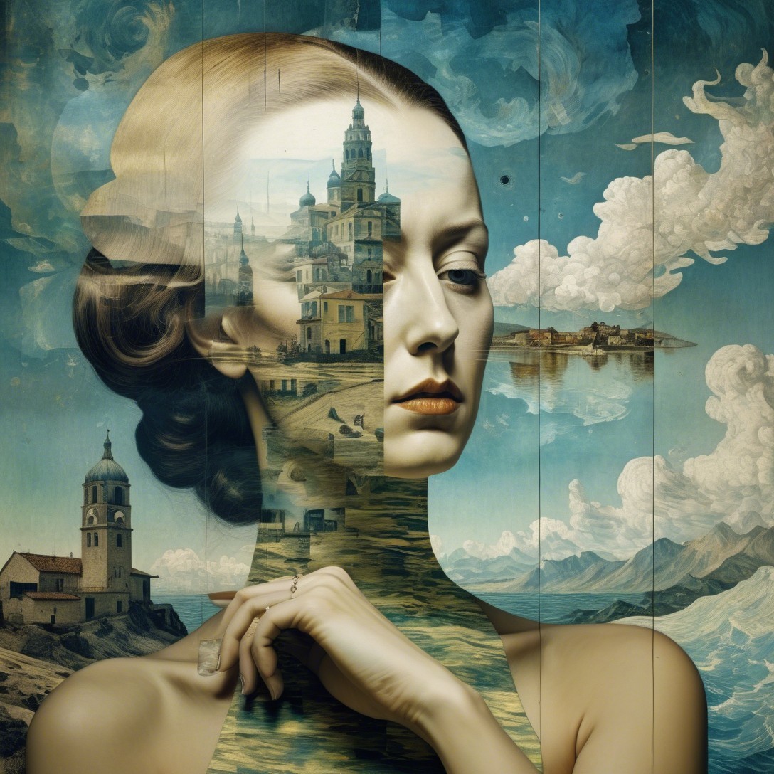 A surreal portrait of a woman, her profile merging with vibrant landscapes and flowers, blending nature and human essence, showcasing creativity and emotive depth.