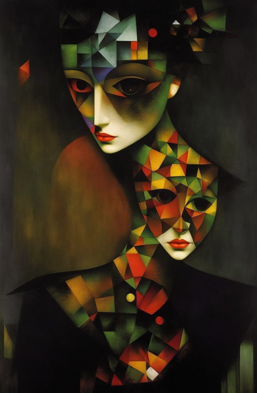 A surreal painting depicts a woman with long red hair and a hat, holding illuminated globes amongst celestial motifs on a dark background.