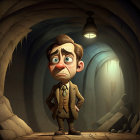 A caricatured figure in formal attire stands in a dimly lit tunnel. The eerie atmosphere is enhanced by distant lights and textured walls, creating a surreal and mysterious setting.