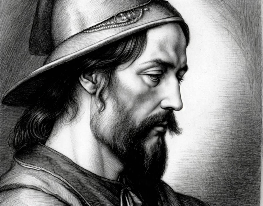 Portrait of a man with a beard and hat in profile, detailed monochrome etching style.