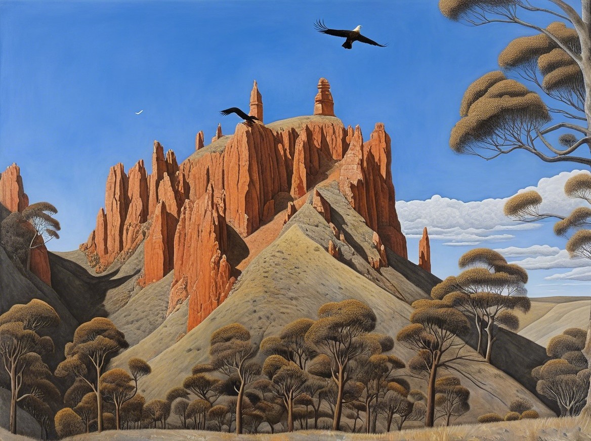 A serene countryside scene features charming cottages with thatched roofs under a bright blue sky. A woman walks alongside a dog, adding a sense of tranquility to the picturesque landscape.