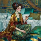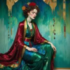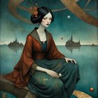 A serene woman with striking red hair sits gracefully in a flowing blue dress and ornate red robe. Colorful hot air balloons float in a dreamy sky, adding to the whimsical atmosphere.