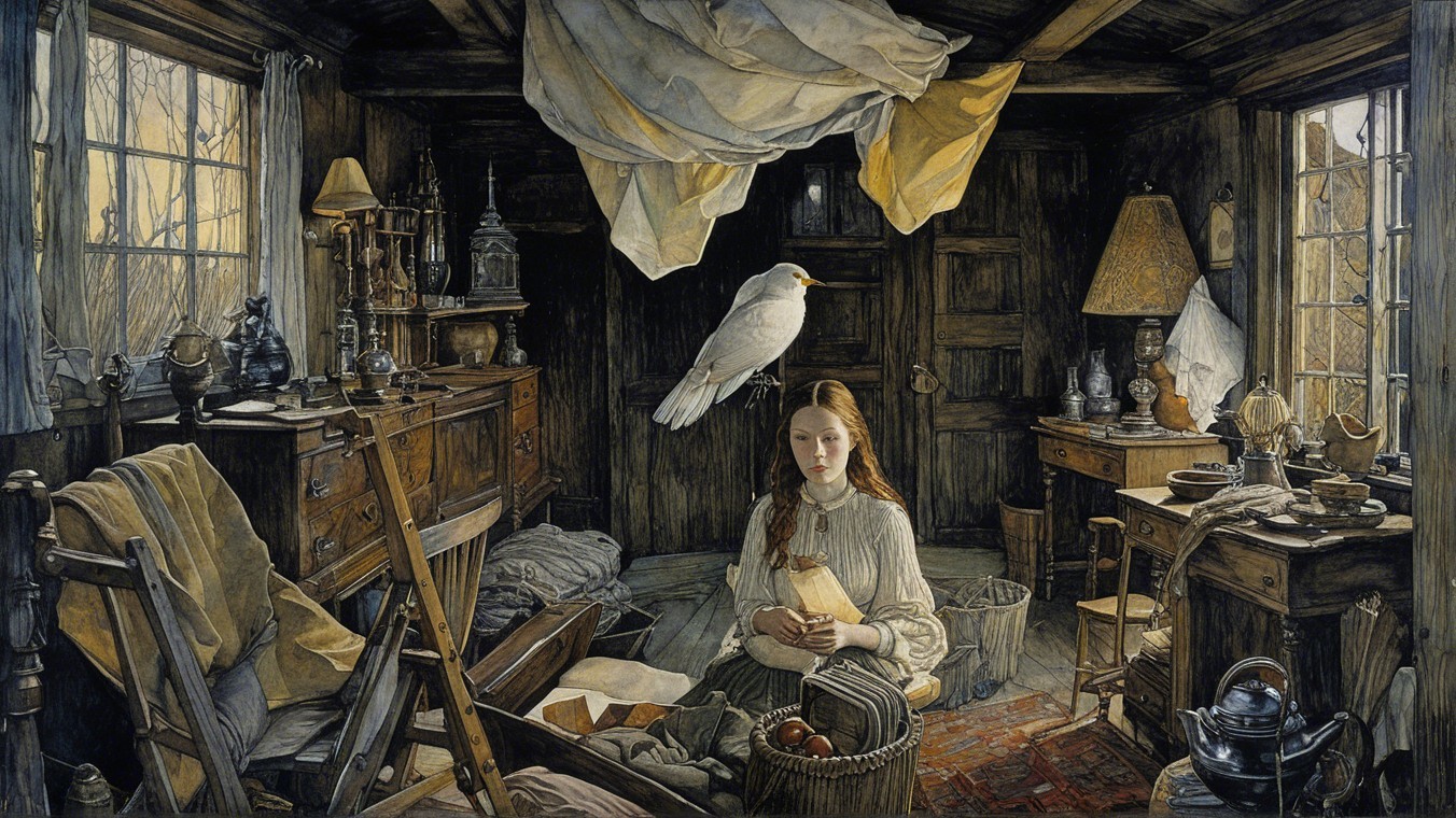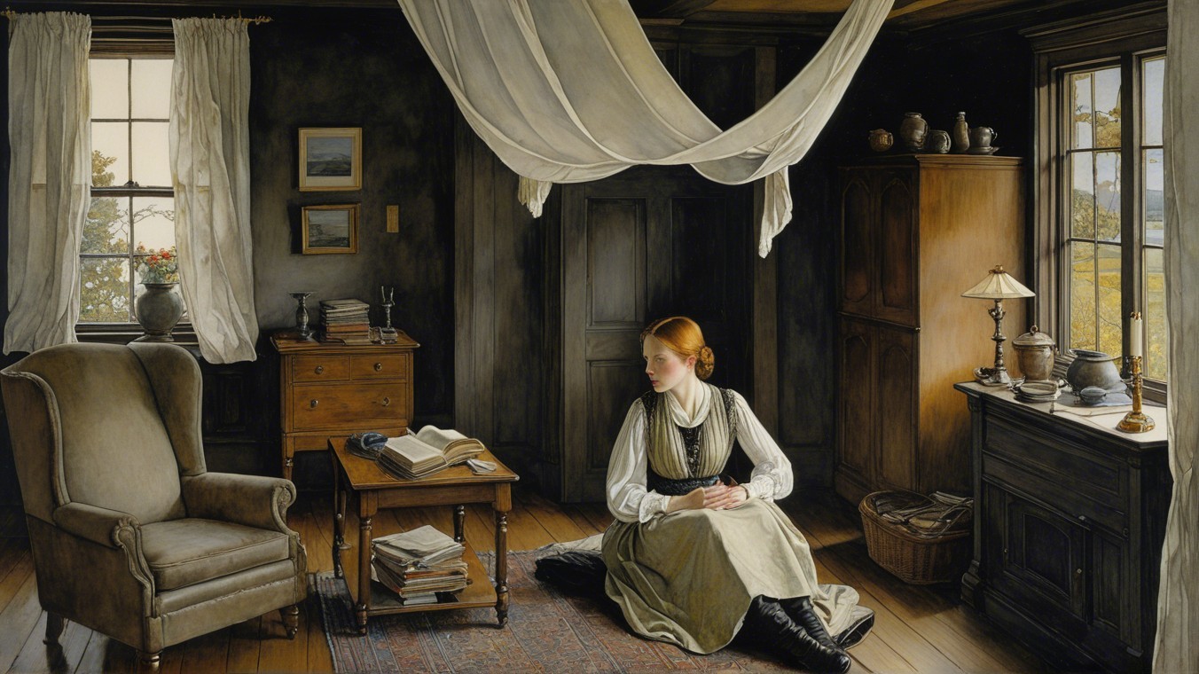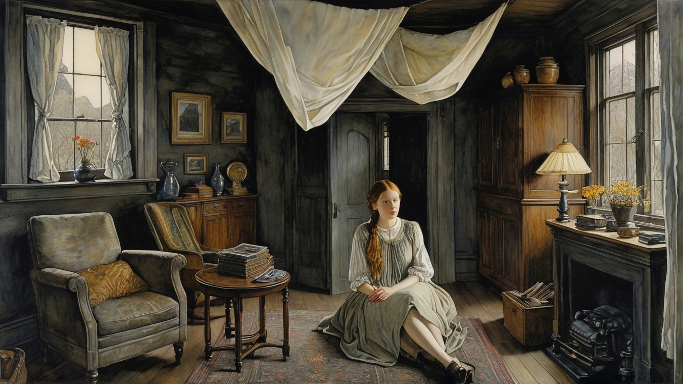 A whimsical scene features a young girl with fiery red hair, sitting among various pumpkins in a rustic setting, veiled in soft cobwebs and shadows, evoking a mystical autumn atmosphere.