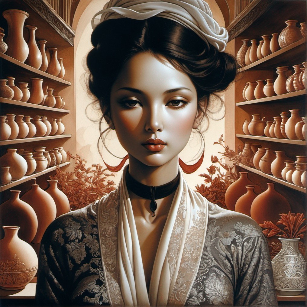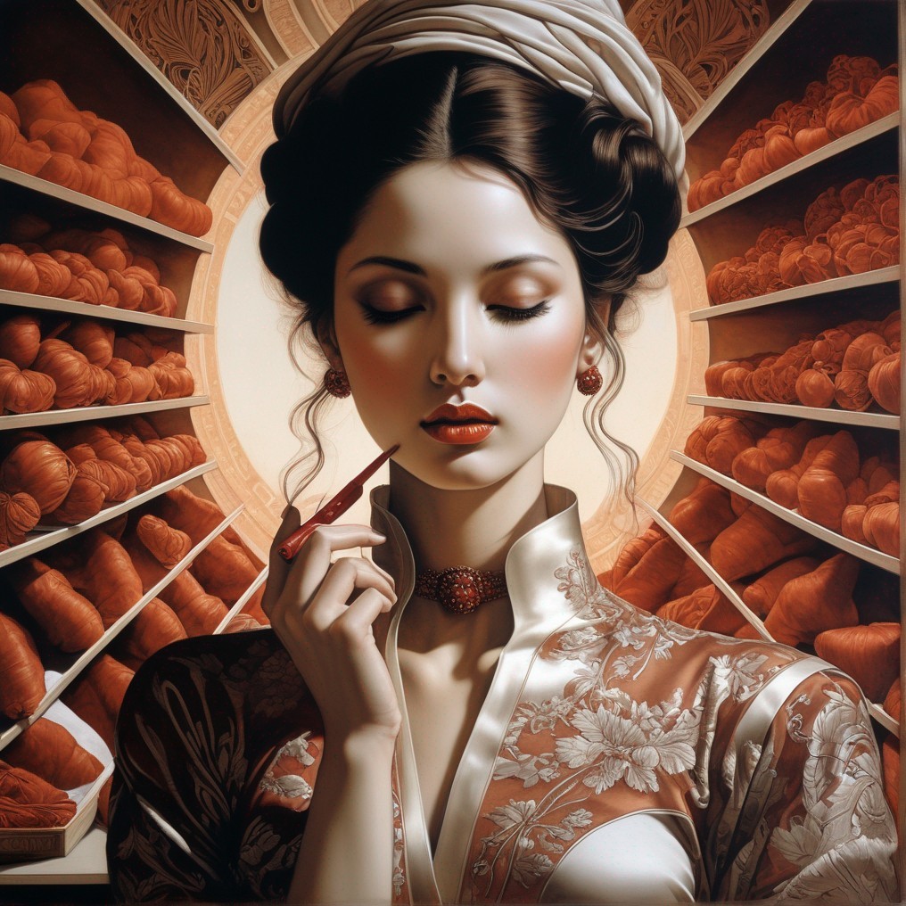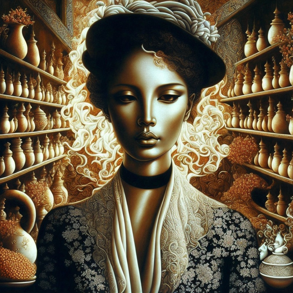 A portrait of a woman with closed eyes, adorned with a red floral headpiece, and a flowing rust-colored scarf, set against a swirling backdrop.
