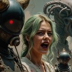 Prompt: Portrait of Udo Kier with weird glasses, as a mad scientist in his lab, with his cyborg. He has a crazed smile, and his eyes are missing. Inspired by 50s pulp b-movie posters. Robotics Painted by Bill Sienkiewicz