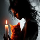 A mystical figure with dark attire and horns holds a candle while cradling an orange cat. Soft smoke swirls around them, creating an enchanting and eerie atmosphere.