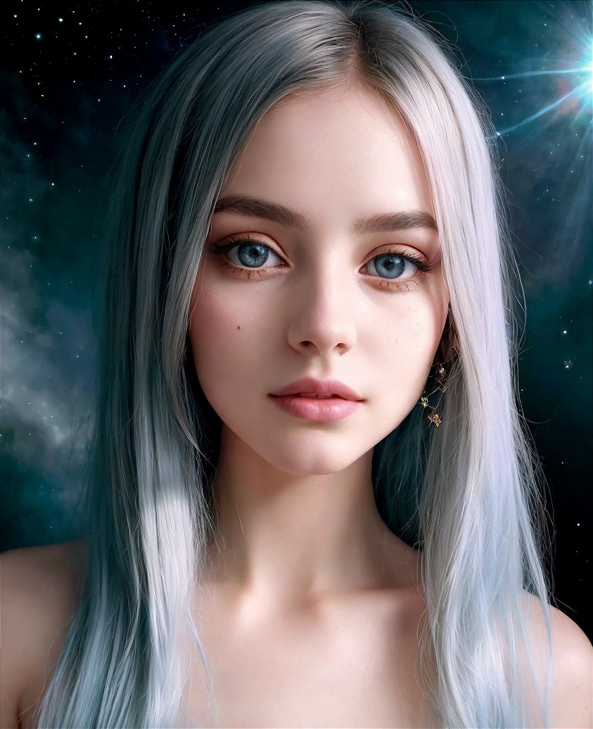 (try it from other user) - A digital portrait of a young woman with silver hair and piercing blue eyes, set against a starry background, exuding a mystical aura.