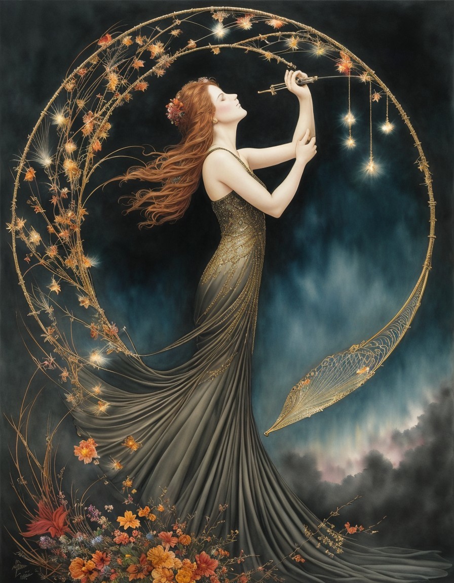An ethereal artwork depicting a winged woman in a flowing dress, holding celestial orbs amidst a mystical backdrop with birds and a crescent moon.