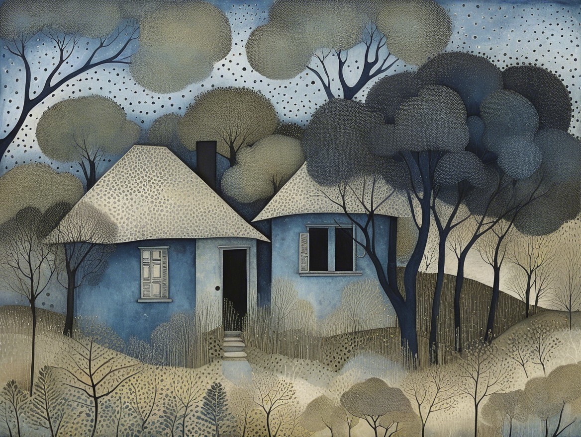 Serene Countryside Scene with Quaint Houses and Twilight Sky