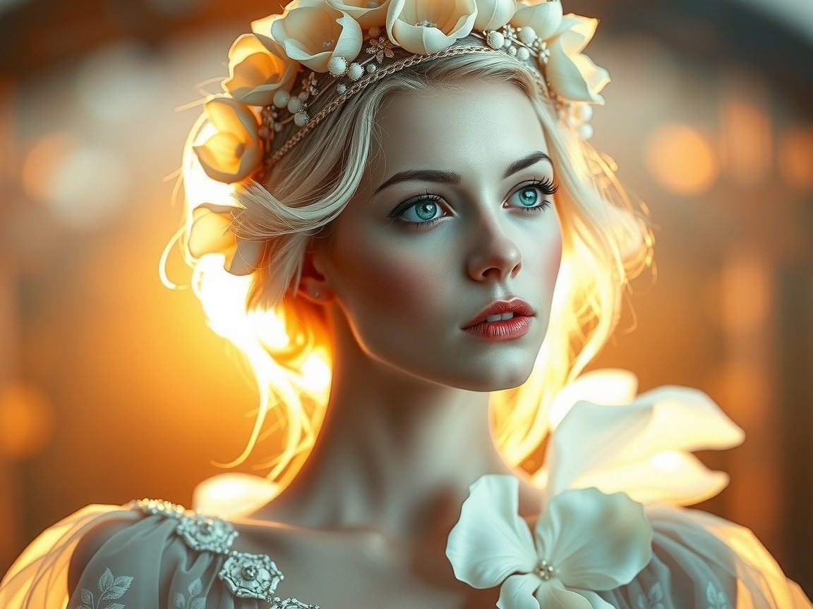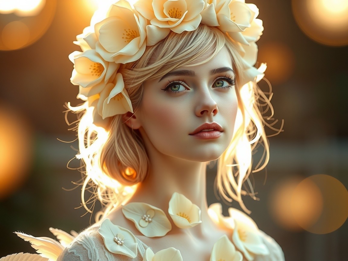 An ethereal portrait captures a young woman with fair skin and soft, symmetrical features. Her enchanting green eyes and feather-like blonde hair are adorned with a floral headpiece. Dressed in delicate, petal-like attire, she exudes tranquility against a softly blurred, sunlit background.