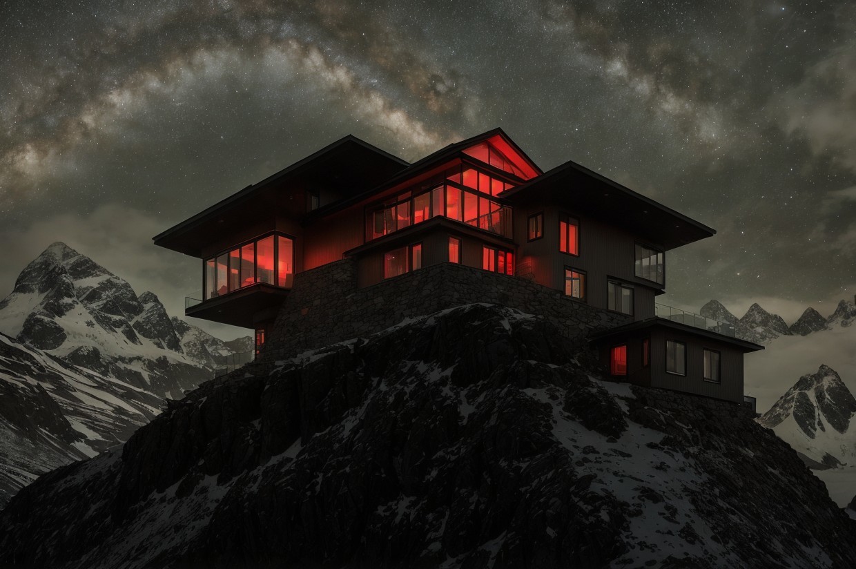 A modern house with red interior lights sits on a rocky outcrop surrounded by snow-capped mountains under a starry sky.