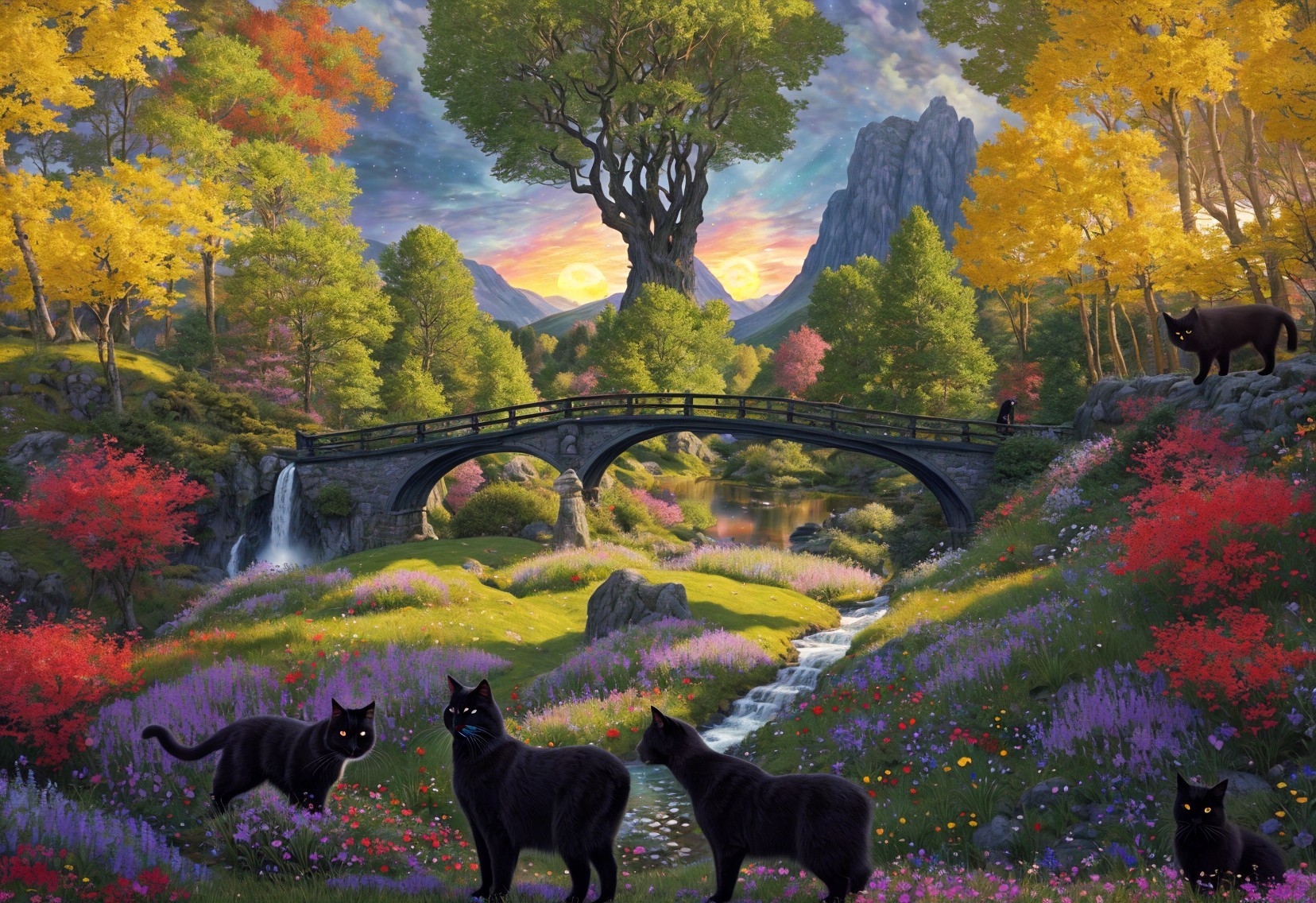Prompt: highland landscape in mountains, black cats, green stream, red and purple glorious sunset over lake, burning fire and red sun, Conquest of Paradise, cosmic sky, nice waterfalls and a beautiful tree and path, bridge over river, some flower details by Gustav Klimt , elegant fantasy, intricate beautiful wallpaper colourful, Van Gogh