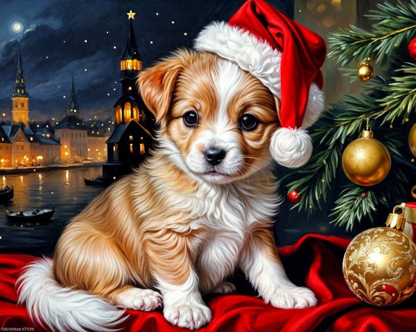 Two charming dogs stand in a snowy landscape. One, a corgi in a stylish black coat and top hat, holds a sparkling staff. The other, a golden puppy, looks on, both exuding a whimsical adventure vibe.