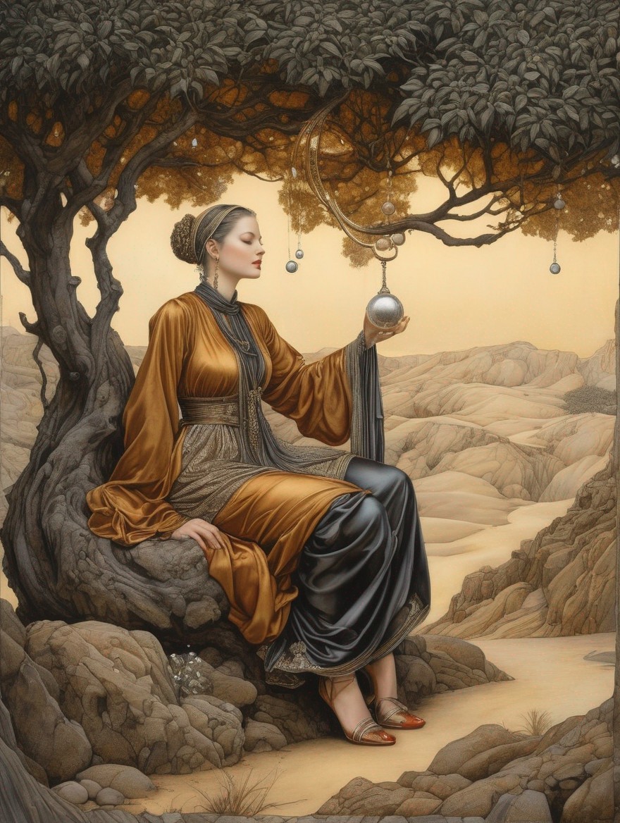 A painting of a woman with flowing red hair, adorned with jewels, gently cradling a globe with a seascape reflection amidst hanging crystals.