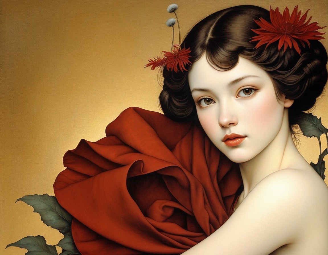 A painting of a woman with pale skin, dark hair adorned with flowers, holding a red parasol, with dandelions in the background.