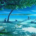 A picturesque landscape features vibrant blue waters, lush greenery, and majestic mountains under a bright sun. Fluffy clouds float above, creating a serene, tranquil atmosphere by the shore.