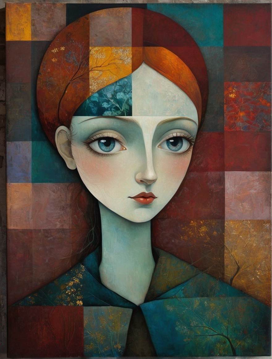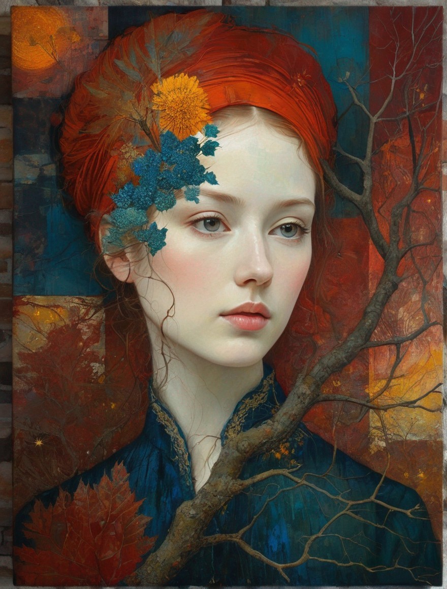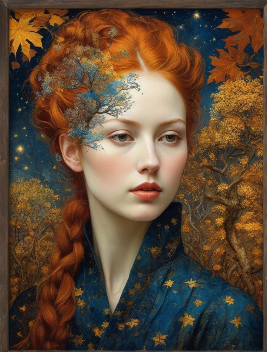 Female portrait painting in profile, pasty tempera on old worn canvas, beautiful mind journey. By Christoffer Relander, Dan Mountford, Van Gogh, Yossi Kotler, Klimt, Victo Ngai, Naoto Hattori. Amazing multiple exposure optical illusion, mixed media, surrealism, otherworldly. Impressive old trees, vines, roots, starry night sky, mountains, rivers, in the clouds, storybook illustration, by Susanne, landscape portrait, perfect face, enigmatic, dreamlike, beautiful lighting, beautiful vibrant colors, ultra detailed seamless blending of two scenes.
