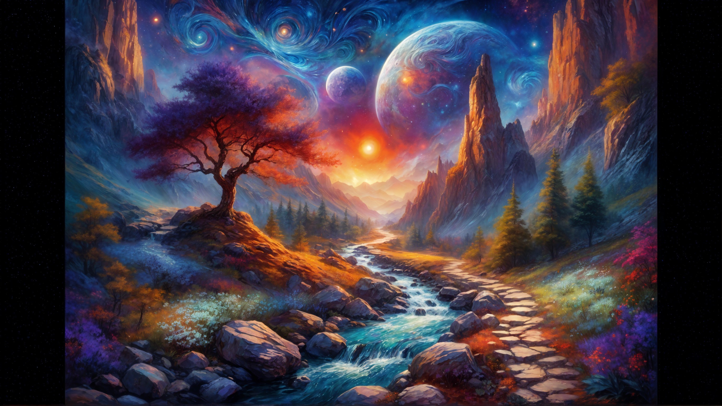 A vibrant fantasy landscape featuring a winding river through colorful rock formations, a solitary tree, and an otherworldly sky with vivid planets and swirling cosmic colors.