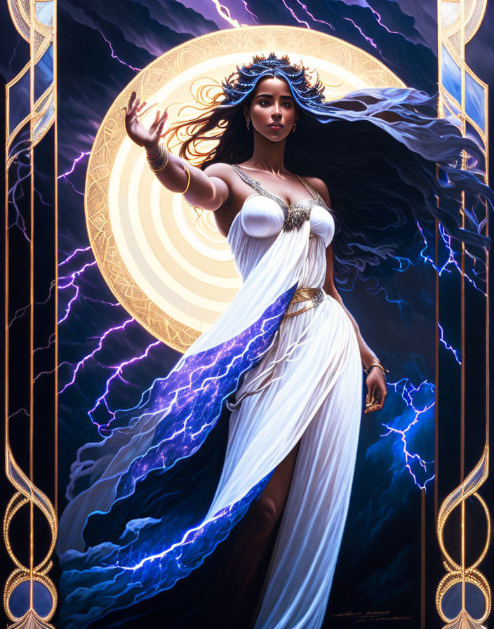 A striking figure stands in front of a luminous full moon, wearing a flowing white gown with blue accents. She reaches out, surrounded by swirling clouds and vivid lightning, embodying a powerful presence.
