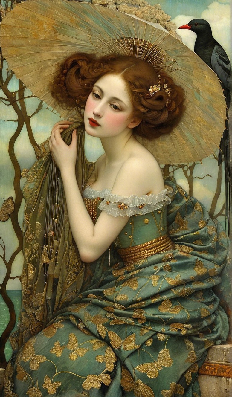 A young woman in a flowing green gown with gold polka dots poses gracefully under a delicate parasol. Soft moonlight illuminates her serene face, capturing a timeless elegance and beauty.