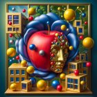 A surreal composition featuring a large red apple intertwined with a face, surrounded by colorful spheres and geometric shapes, framed by a vibrant backdrop of abstract greenery and textures.