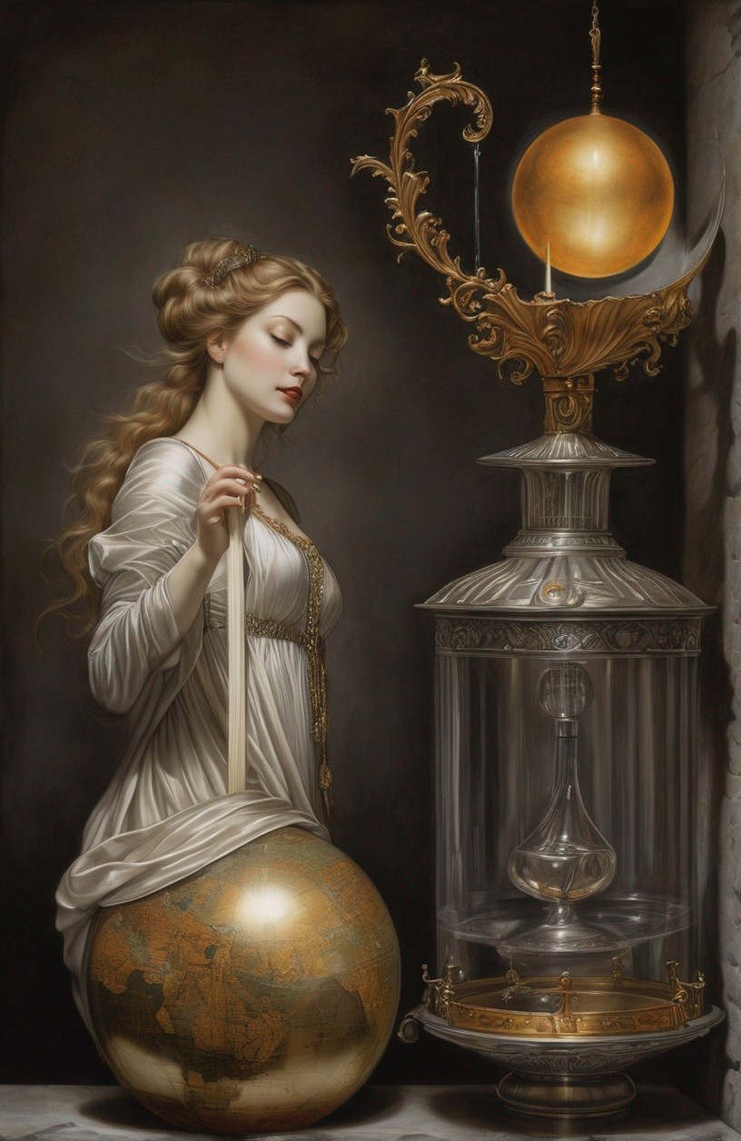 A woman in flowing garb holds a crystal ball, with an ornate lantern and sphere behind her, evoking a mystical or fantasy ambiance.