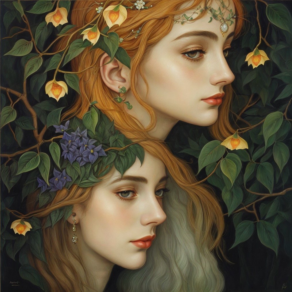 Two Women with Reddish Brown Hair and Green Leaves Illustration