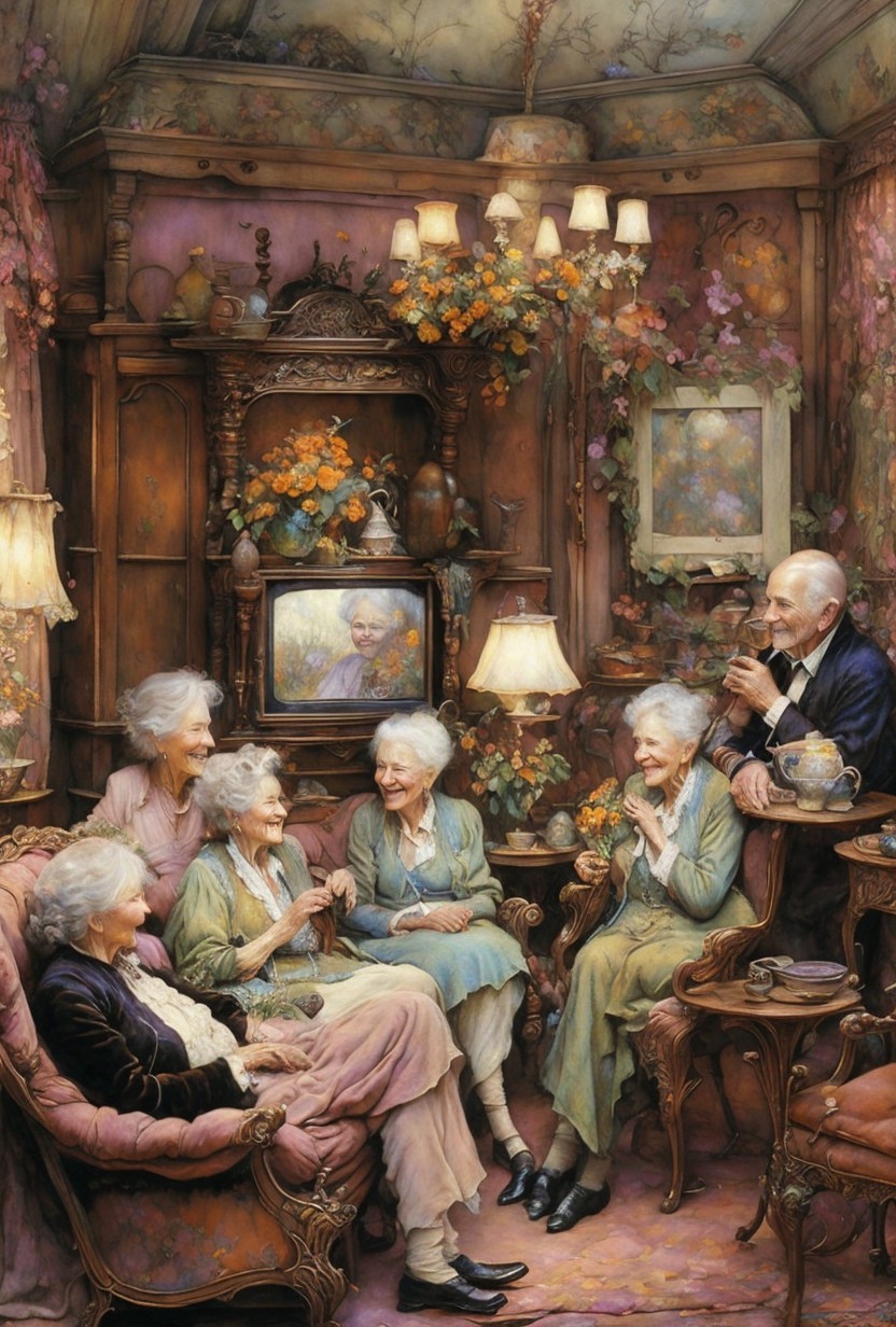 A cozy room with warm lighting features five elderly women joyfully chatting. They sit in vintage furniture, surrounded by charming decor, creating a scene filled with friendship and nostalgia.