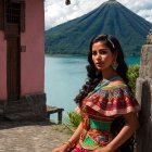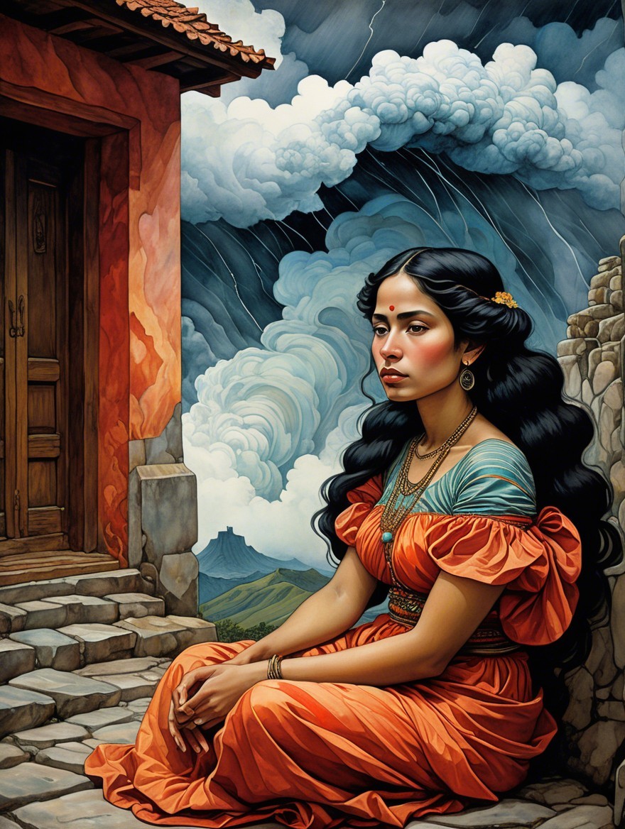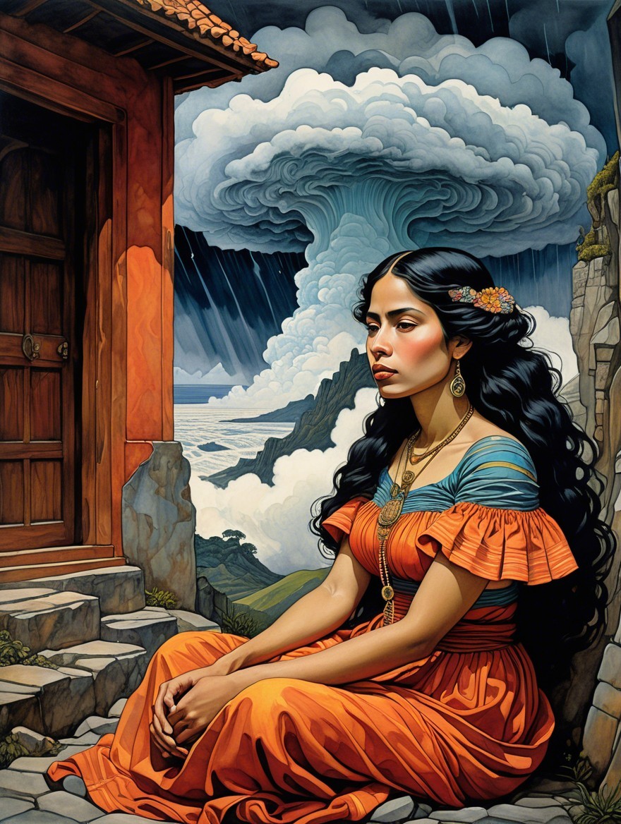 Woman in Colorful Dress Amidst Stormy Landscape