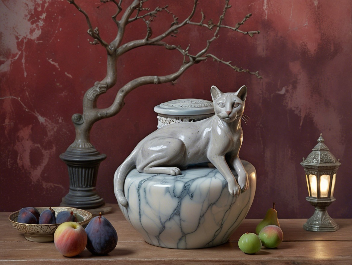 Prompt: Still life with depth of field, smooth, finely painted oil painting, rough ceramic vessel with grey cat, detailed fur, bright three-dimensional depicted bare branches, fig, transparent glass Bastet statue in cat form, transparent lace, fruits, the background is marbled as if dark red paint and a little blue and green were flowing cloud-like, shiny, reflective tiled floor, sharp background, inspired by Charles van den Eycken