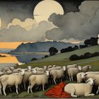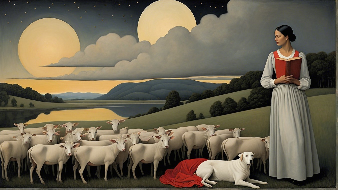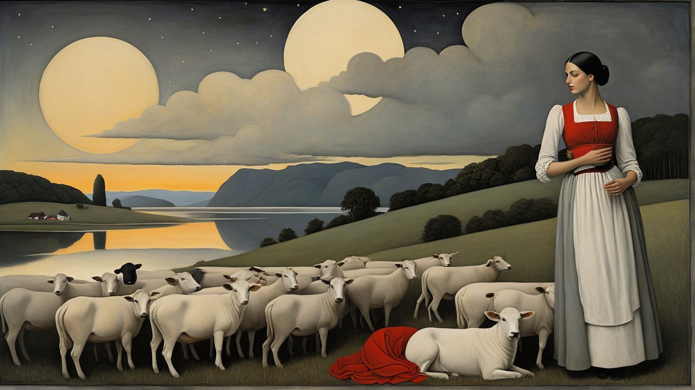The image features two women in flowing dresses by a serene river. One sits on the grass, while the other stands nearby, gazing thoughtfully. Two large moons illuminate a tranquil landscape.