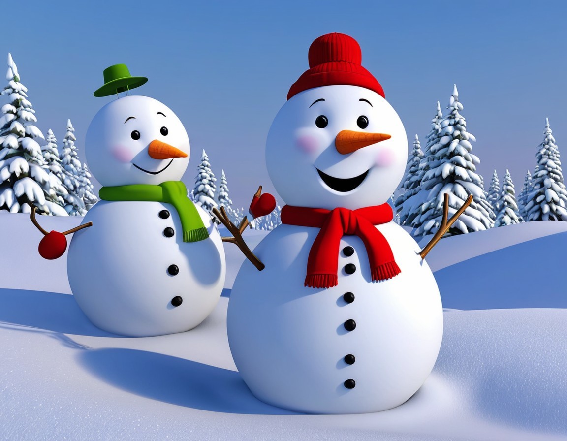 Funny snowmen smiling in winter forest