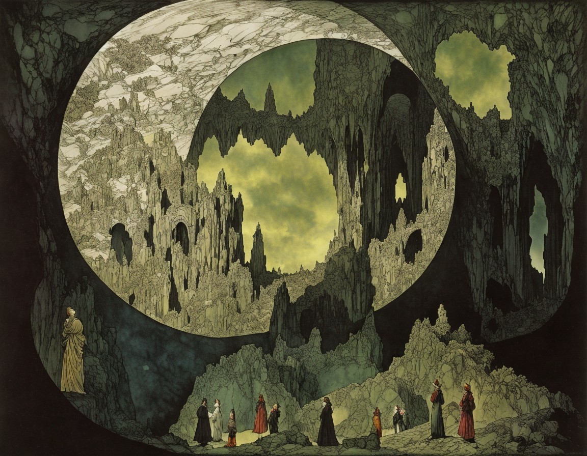 In a mystical cave, two elegant women stand by a serene waterway, one in flowing blue attire and the other in golden fabric, surrounded by dramatic rock formations and soft lighting.