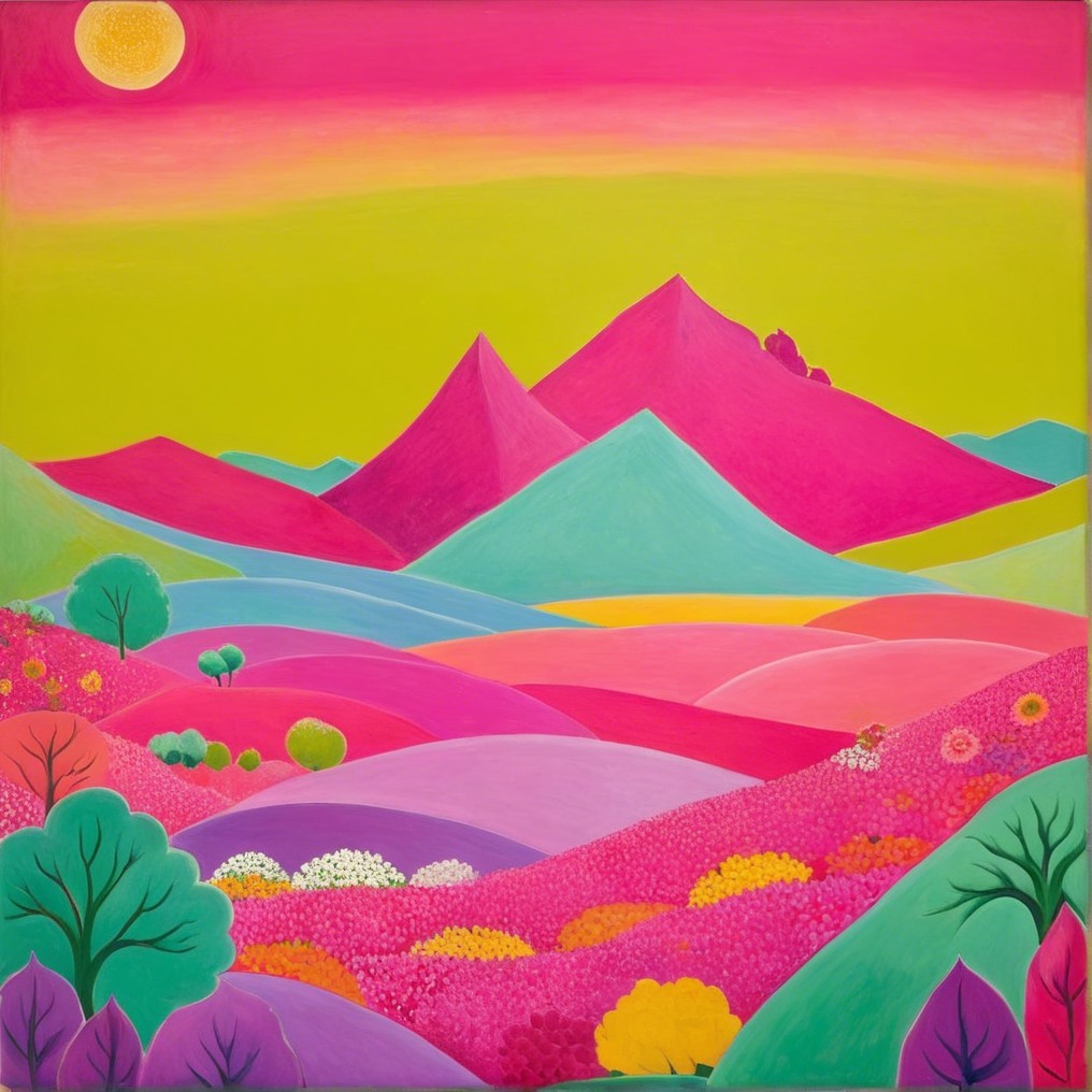 A vibrant landscape features rolling hills in shades of pink and green, dotted with colorful flowers. A bright sun hangs in a vivid sky, enhancing the cheerful, dreamlike atmosphere.
